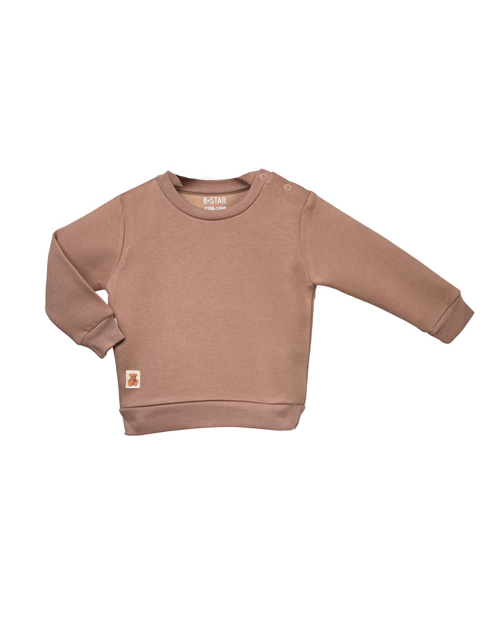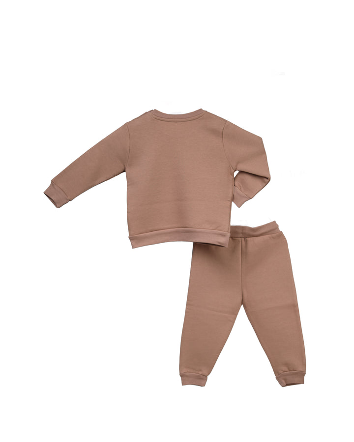 This cozy and stylish two-piece baby outfit features a soft, long-sleeve sweatshirt paired with matching jogger pants. Made from a breathable cotton-blend fleece, it provides warmth and comfort for active little ones while ensuring ease of movement. The sweatshirt includes shoulder snap buttons for easy dressing, and both pieces have ribbed cuffs for a snug fit. The jogger pants come with an elastic waistband and a drawstring for adjustable fitting. The set is perfect for casual outings, playtime, or relaxing at home, offering a minimalist, earthy tone suitable for both boys and girls